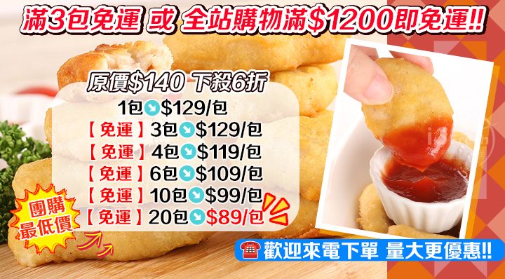 產品成份:雞肉(組合)、雞皮、裹漿粉[麵粉、玉米澱粉(非基改)、胡椒、大豆油、水解大豆蛋白(非基改)、酸性焦磷酸鈉、碳酸氫鈉、L-麩酸鈉]、精製軟棕油、大豆蛋白(非基改)、鹽、味精、馬鈴薯澱粉、玉米澱粉(非基改)、多磷酸鈉、焦磷酸鈉、偏磷酸鉀、小麥蛋白、胺基乙酸、DL-胺基丙酸、糖、琥珀酸二鈉、5'-鳥嘌呤核苷磷酸二鈉、5'-次黃嘌呤核苷磷酸二鈉、麥芽糊精、雞油、香料、酵素製劑(甘油、麥芽糖醇、谷氨酰胺轉氨酶)