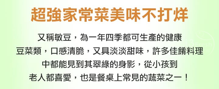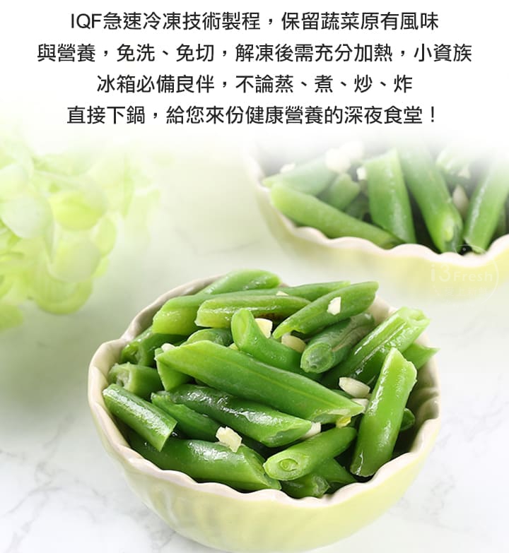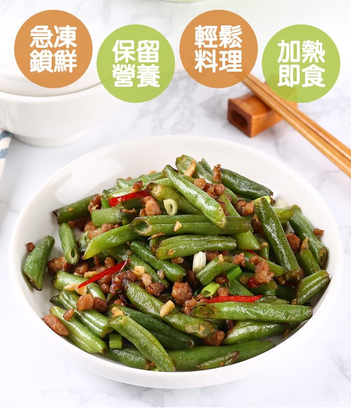嚴選優質四季豆以I.Q.F急速冷凍,瞬間鎖住蔬菜的清甜與營養,快速備餐的祕密武器,省時省工又便利!