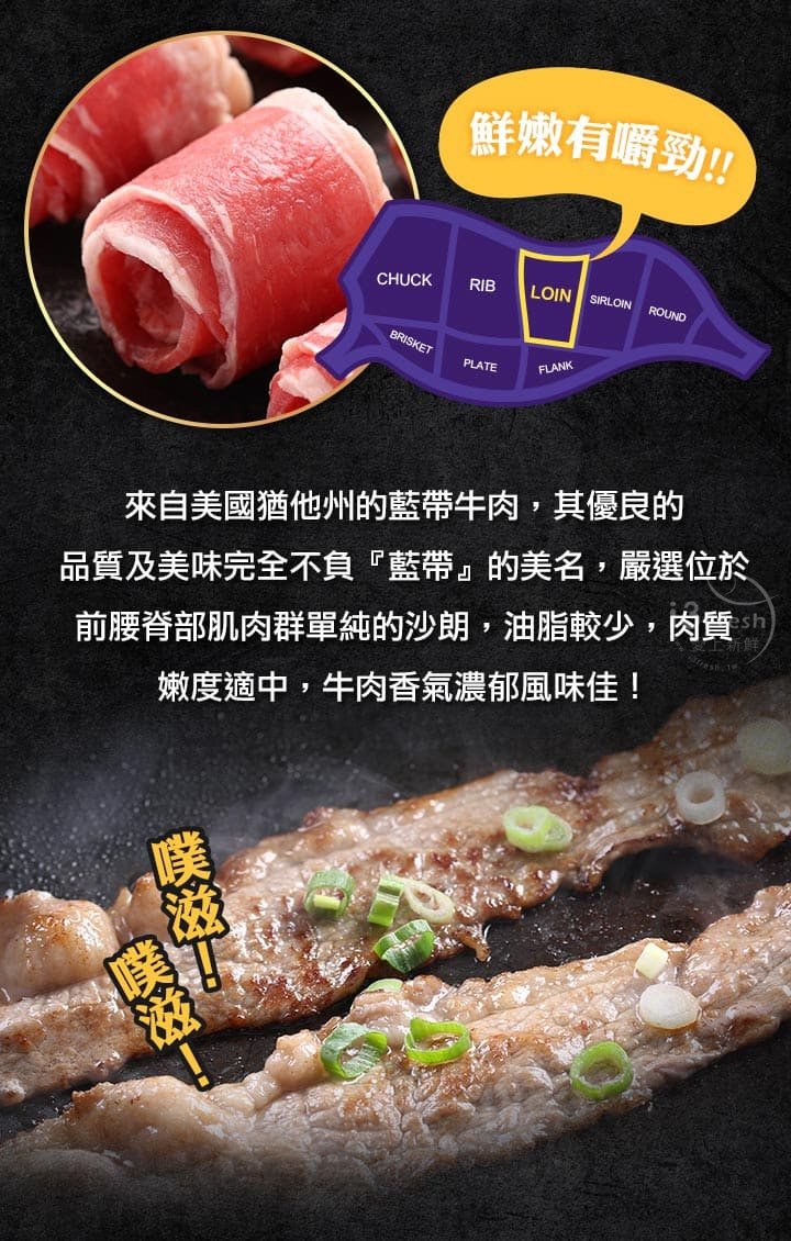 來自美國猶他州的藍帶牛肉,優良品質及美味完全不負『藍帶』美名,選切自Loin部位,口感Q彈香氣濃郁,不論是火鍋、燒烤、炒肉均是經濟又實惠的最佳選擇!