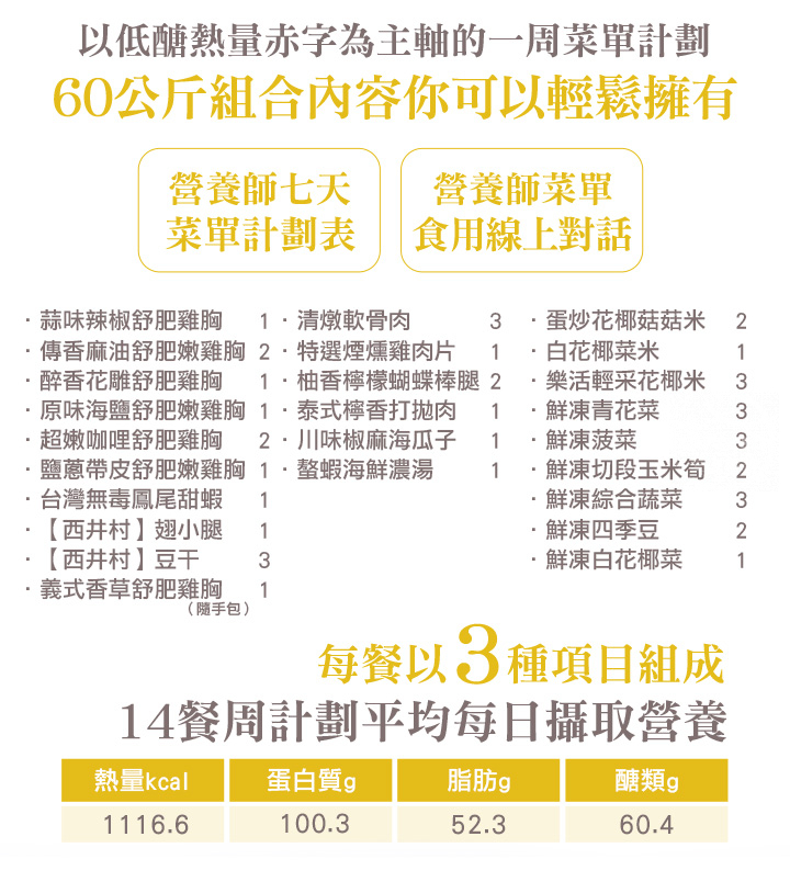醣質OFF低醣攝取計劃PLUS,加強基礎計劃強度,方便更不失美味,今年就讓我們陪您一同堅持成功,跟著一休七天14餐教你聰明輕鬆吃!