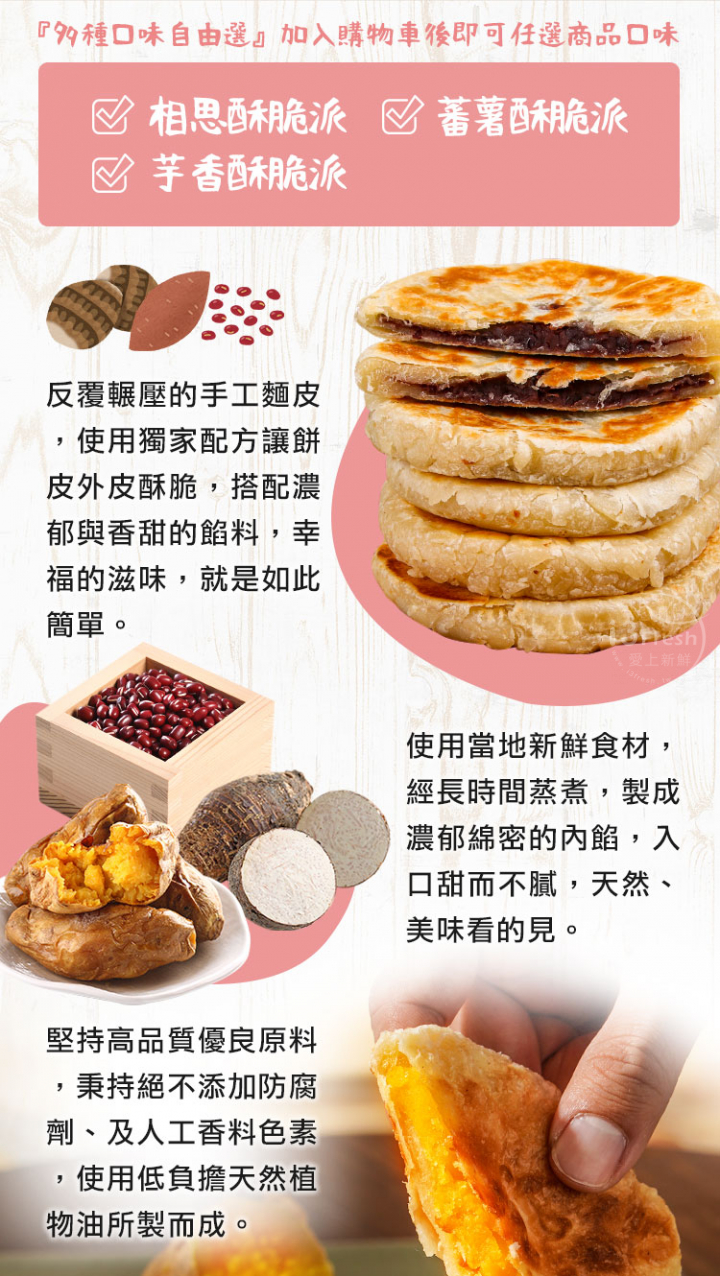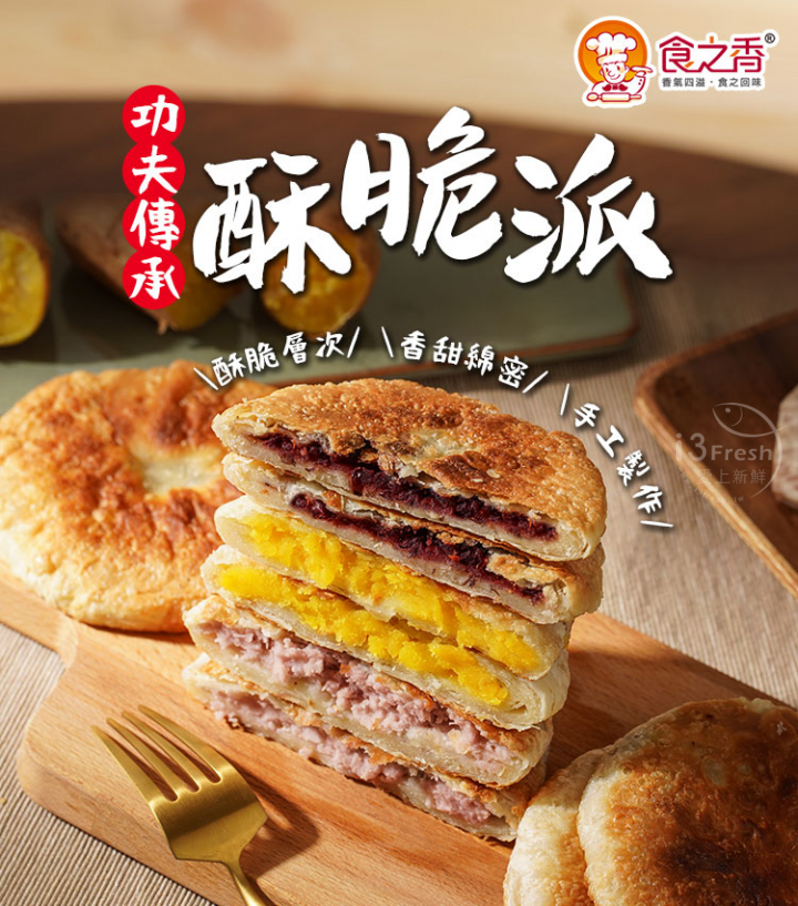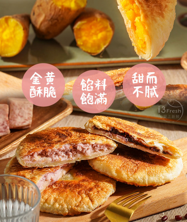 使用獨家配方讓手工麵皮外皮酥脆層次堆疊口感絕佳,外層酥脆層次豐富的餅皮,相思(紅豆)/芋香(芋頭)/番薯三種口味,天然、美味看的見,幸福的滋味,其實就是如此簡單。