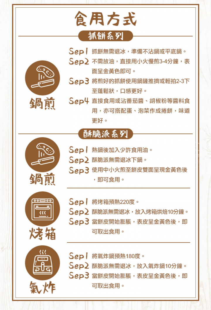 食用方式:本產品不必解凍。將平底鍋熱鍋後,加入少許的油,將餅放入鍋中煎至兩面呈金黃色即可食用。