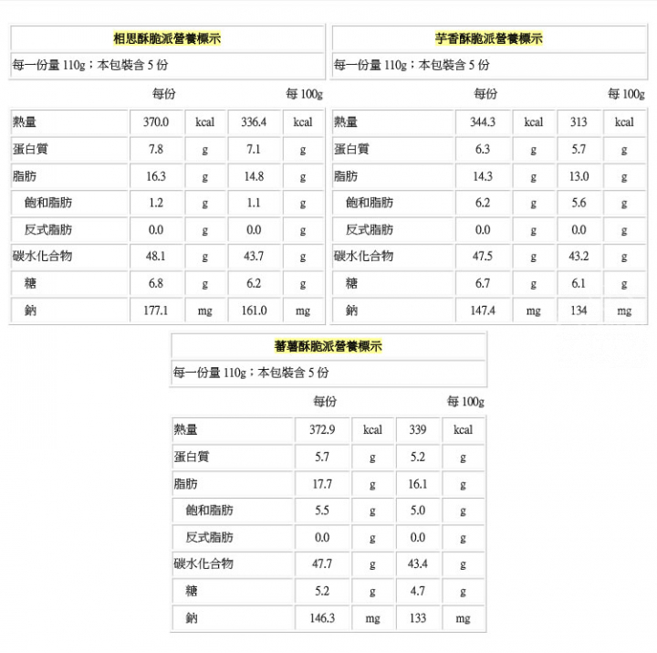 產品成份:麵粉、地瓜餡、水、白油(精製棕櫚油)、大豆沙拉油、鹽、糖、複方膨脤劑(醋酸澱粉、酸性焦磷酸鈉、碳酸氫鈉、玉米澱粉、磷酸二氫鈣、碳酸鈣、檸檬酸)